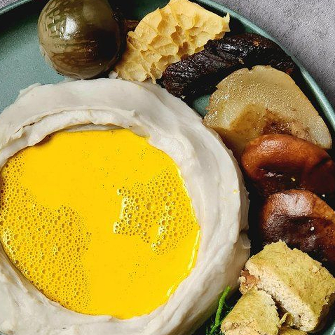 Achu Soup, also called Yellow Soup, is a traditional delicacy of the Northwest Region of Cameroon. It is served with achu (pounded cocoyam) and is a centerpiece dish at cultural celebrations, weddings, and family gatherings. The soup gets its distinctive golden color from red palm oil combined with limestone water (kanwa), which creates a silky, slightly foamy texture. Rich in flavor, it is prepared with a variety of meats, offals, and sometimes smoked fish, and seasoned with local spices. The taste is both earthy and tangy, with a smooth, unique consistency that pairs perfectly with the soft mound of achu.