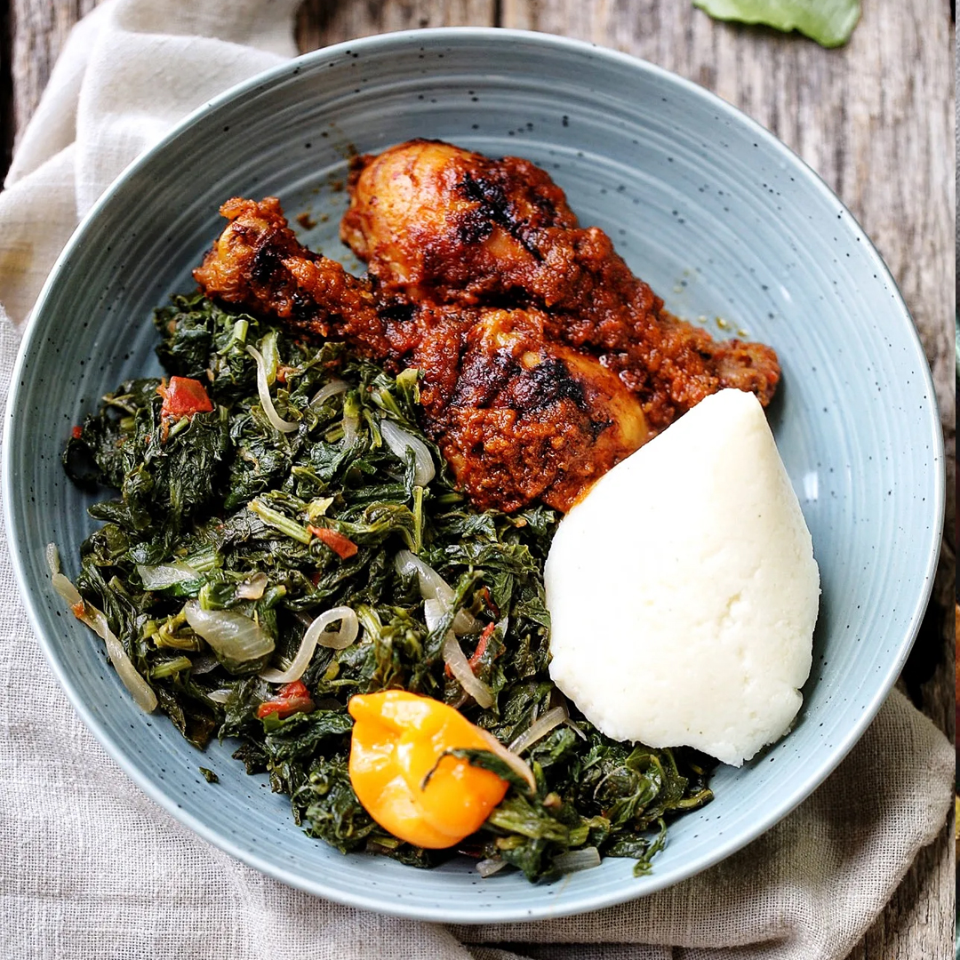 Kati Kati is almost always paired with fufu corn (a smooth, dough-like staple made by stirring maize flour into boiling water until firm). The soft, stretchy fufu perfectly complements the rich, oily chicken, making the combination one of Cameroon’s most iconic meals.